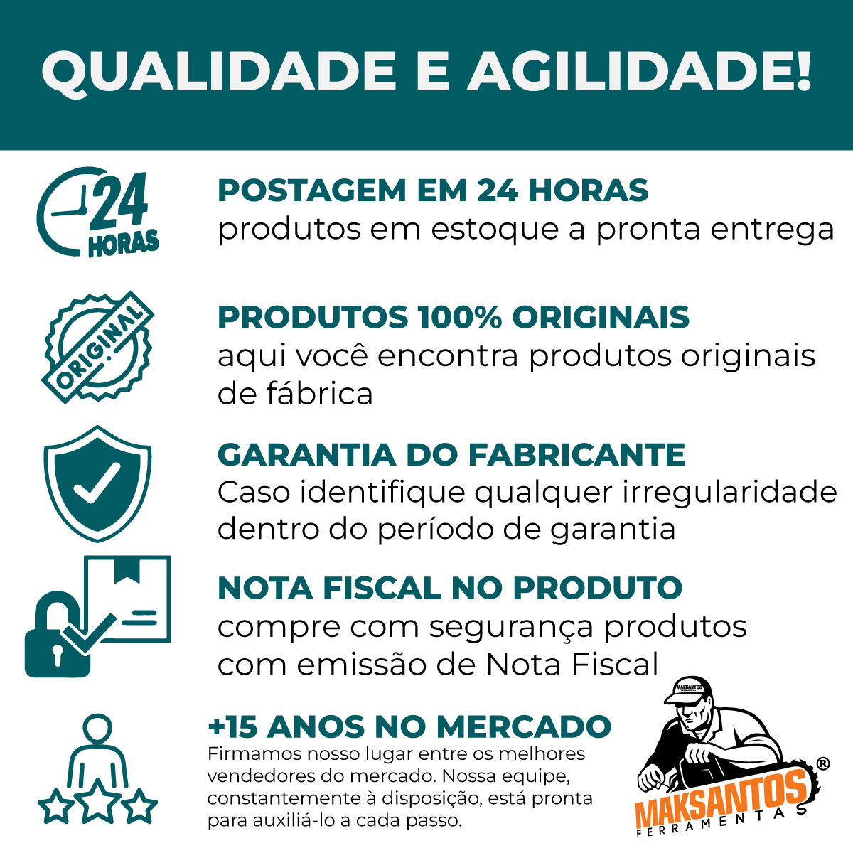 MakSantos Ferramentas há 15 anos de excelência! Sua melhor escolha em ferramentas de qualidade com nota fiscal e garantia. Dúvidas? Estamos aqui para ajudar. Boas compras!